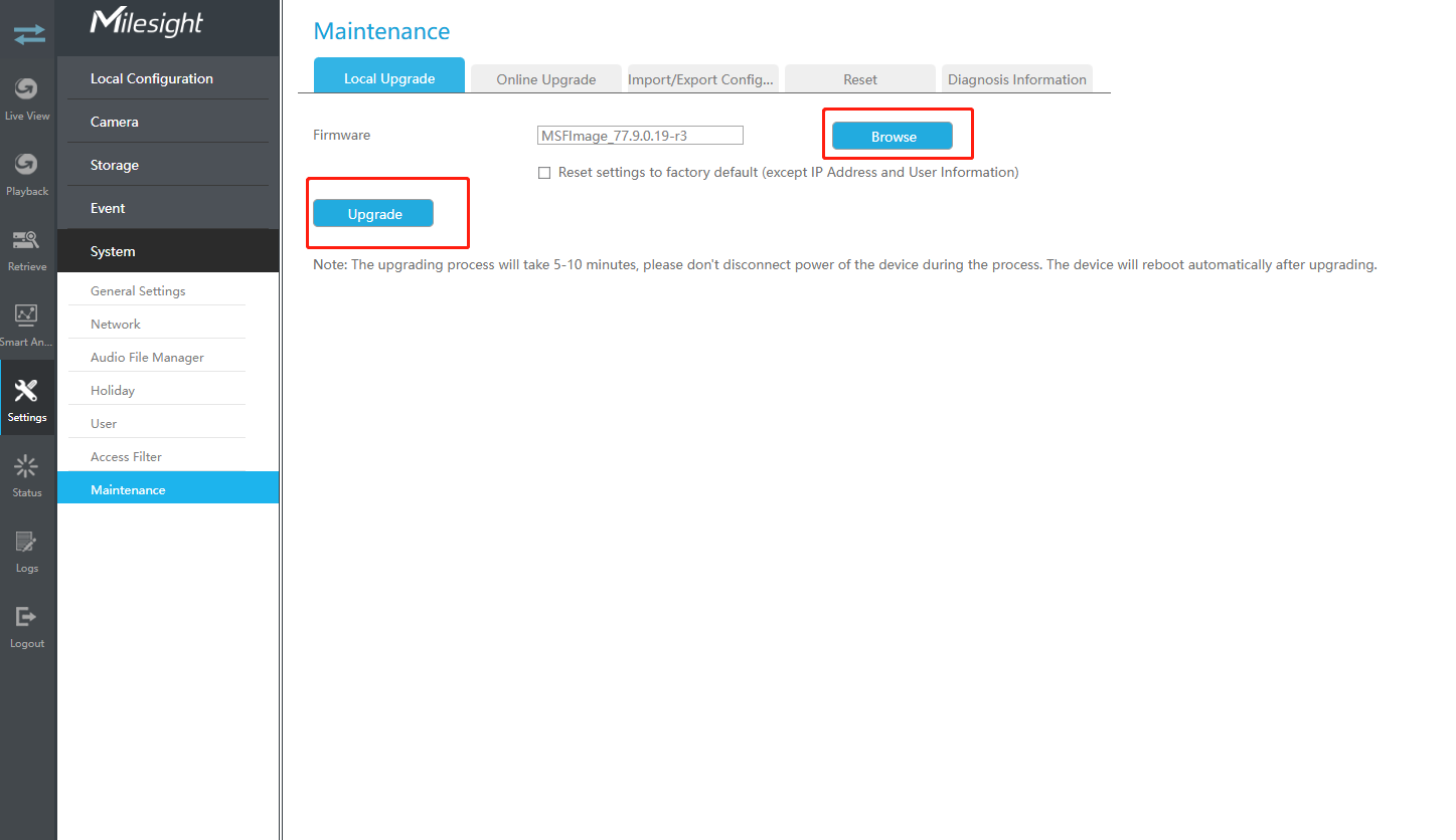 Step1: “Settings”→“System”→“Maintenance”→“Local Upgrade”.