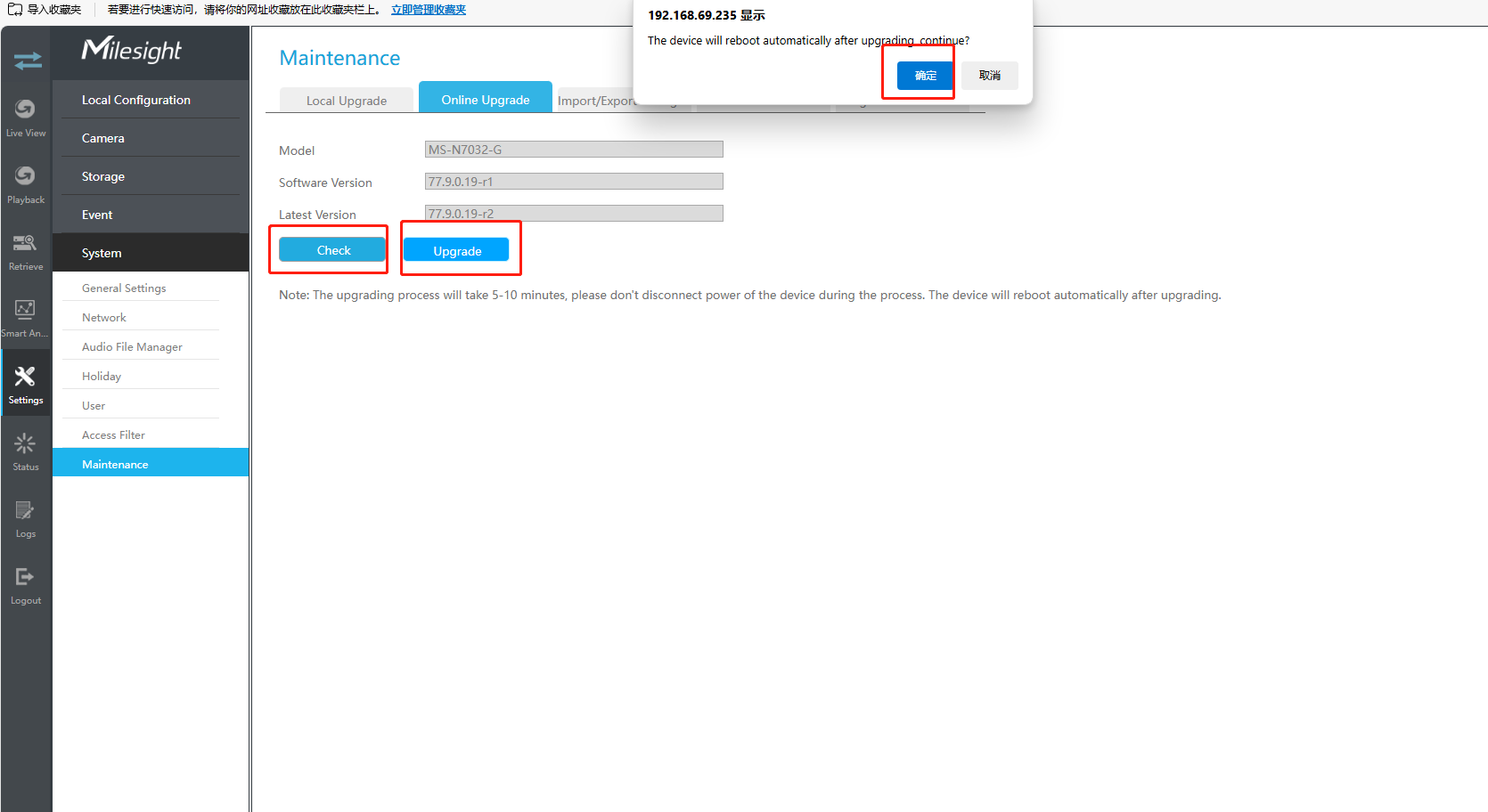 The upgrading process will take 5-10 minutes, please don’t disconnect power of the device during the process. The device will reboot automatically after upgrading.