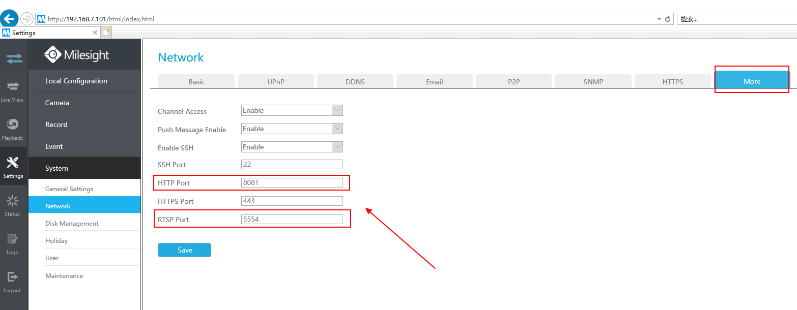 2. Login the NVR web management, change the HTTP port number to 8081. Change the RTSP port to 5554.