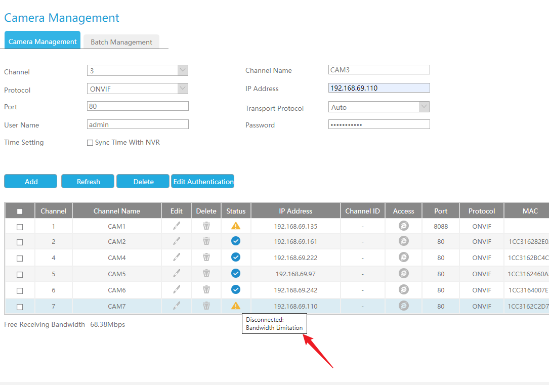 NVR devices have bandwidth limitation. When the connection bandwidth exceeds the capacity that NVR can take, NVR will judge that the cameras are not added successfully.