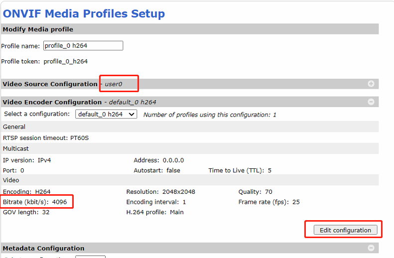 3. Click on ONVIF media profiles, select a user for Video Source Configuration and modify profile_0 h264 bit rate. You can set the bit rate to 4096 Kbps or around.