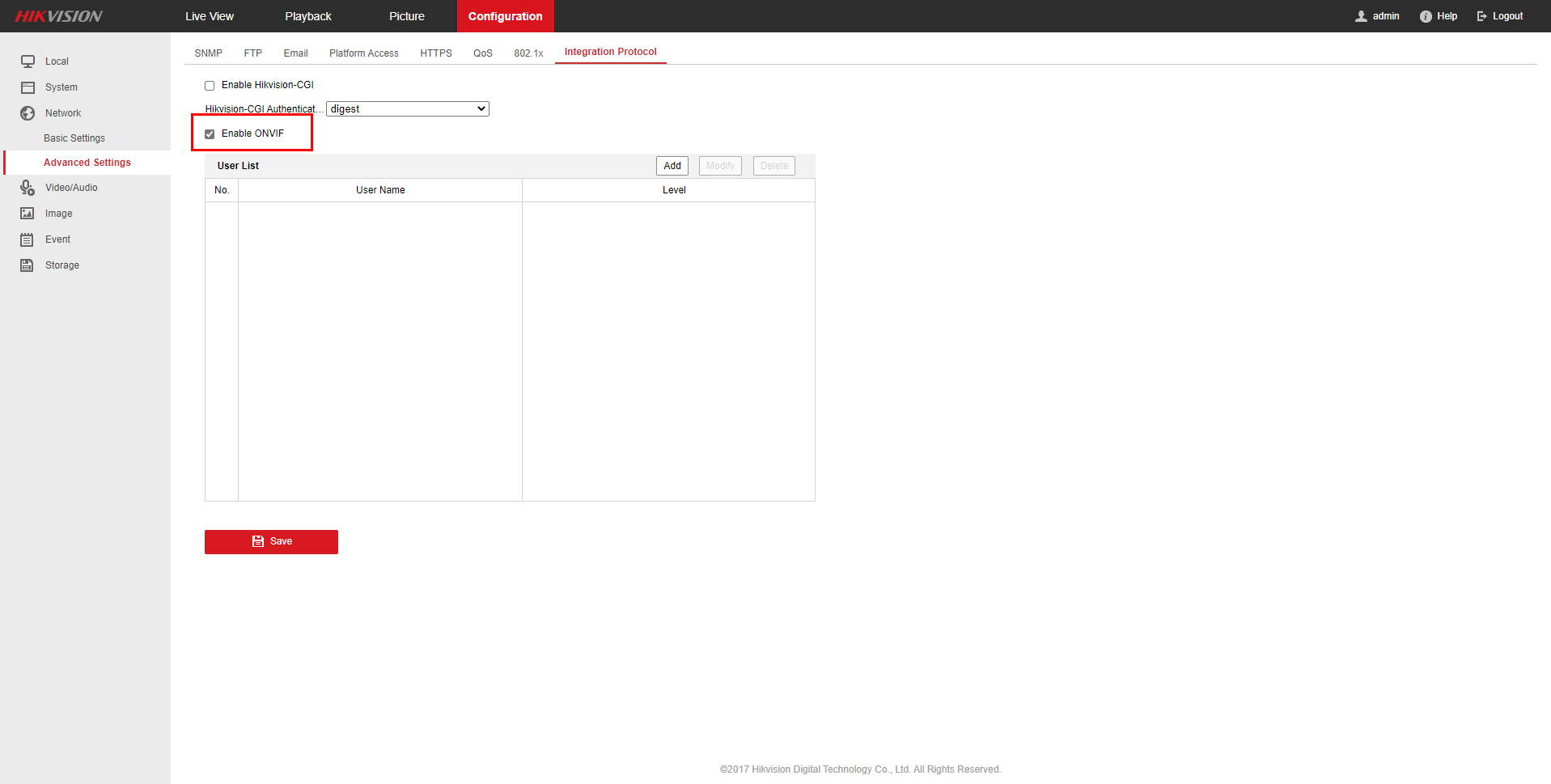 Ensure the ONVIF is Enabled. For most of IP cameras, ONVIF is an optional protocol as shown in the figure below: