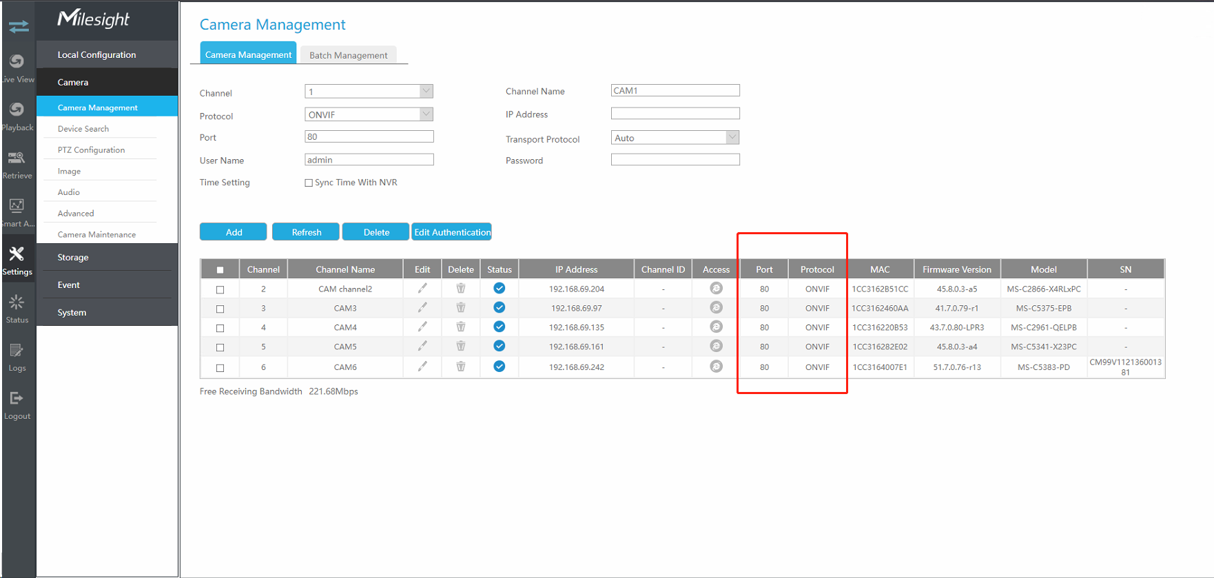 Check the ONVIF port of camera. Ensure the filled ONVIF port is correct. In most cases, the port of ONVIF is 80, so the default port value of Milesight NVR ONVIF protocol is 80. But some third-party cameras' ONVIF ports are not, as Grandstream’s camera is 8080.