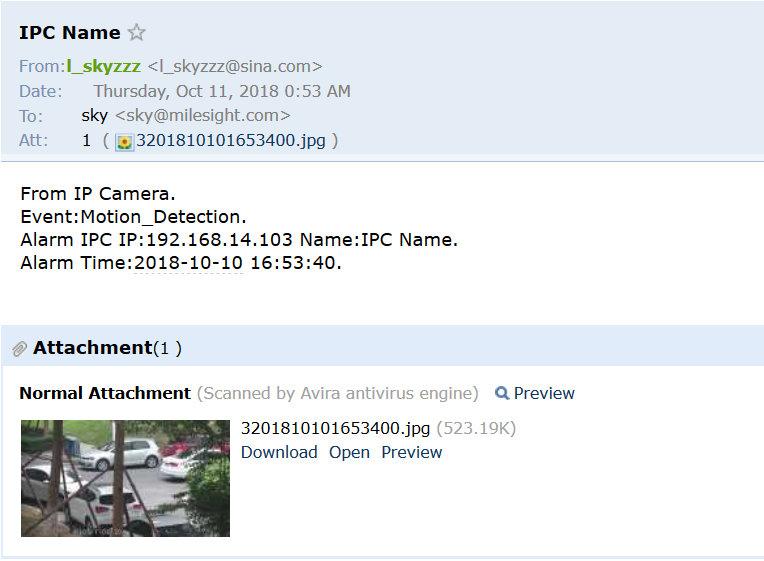 After setting motion detection and alarm action successfully, when the motion detection is triggered, you will receive an Email and the detail as follows.