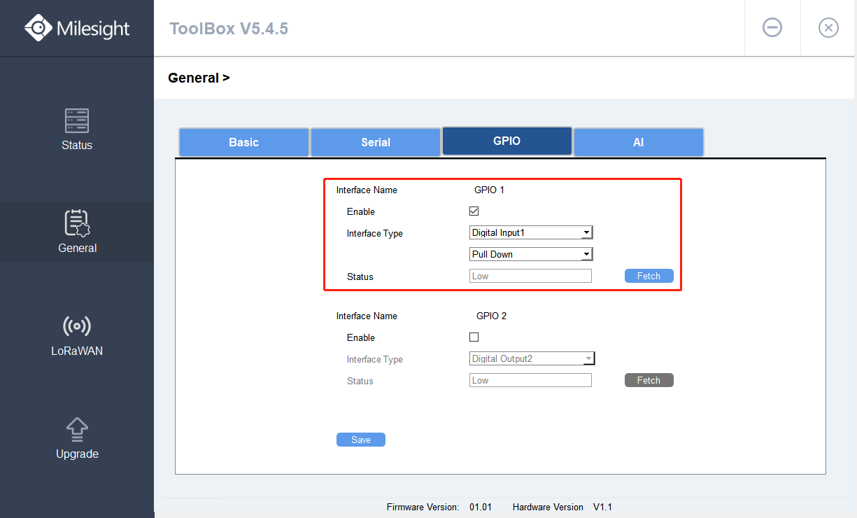 Digital Input and Digital Output are available. If Digital Input is selected, you can further choose Pull Down or Pull Up.