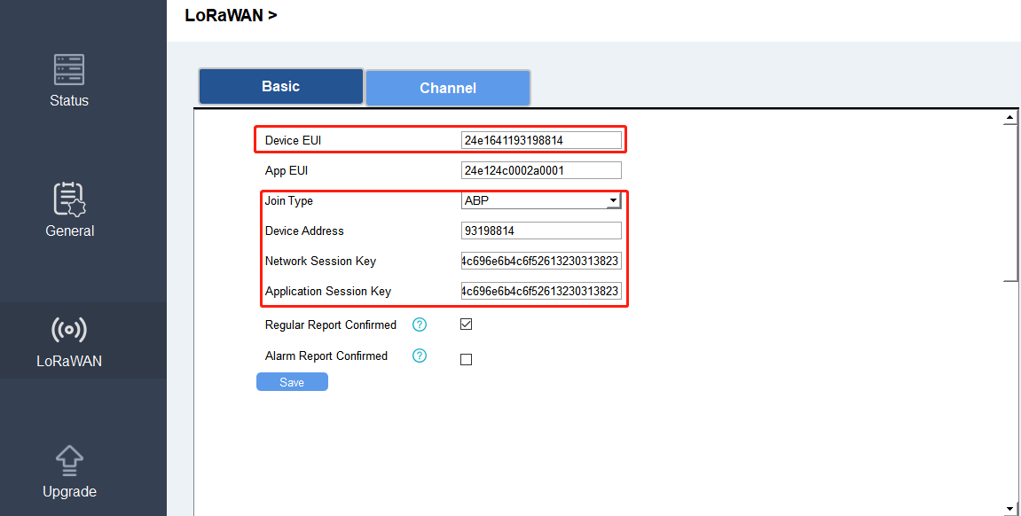 ABP: Fill the information of Device EUI, Device Address, Network Session Key and Application Session Key displayed on the Tool Box in IoT network cameras' End Device Management configuration page.