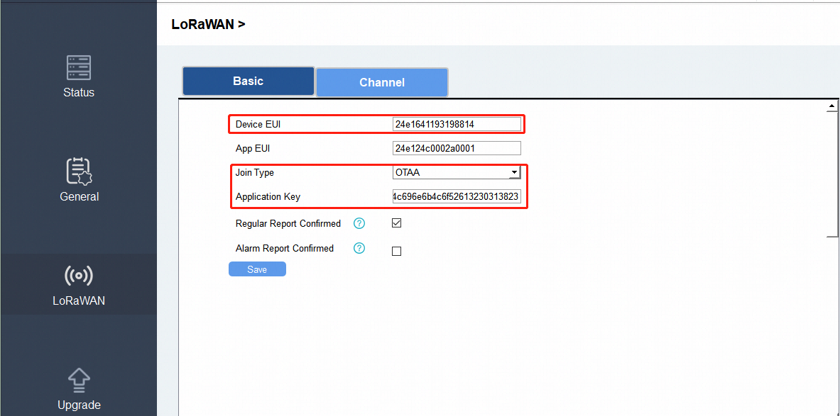 OTAA: Fill the information of Device EUI and Application Key displayed on the Tool Box in IoT network cameras' End Device Management configuration page.