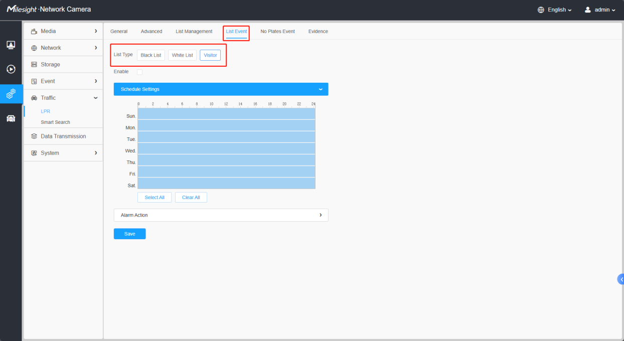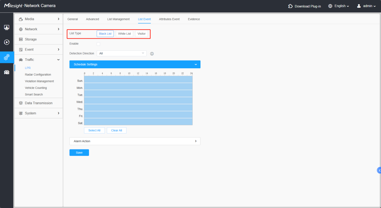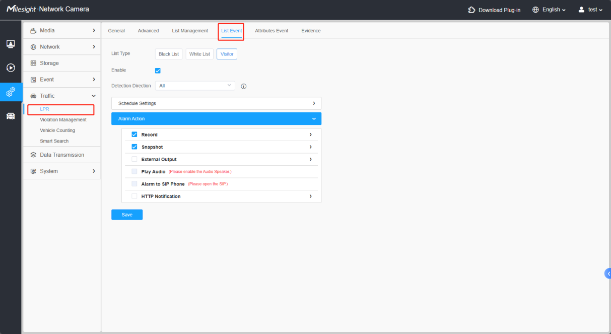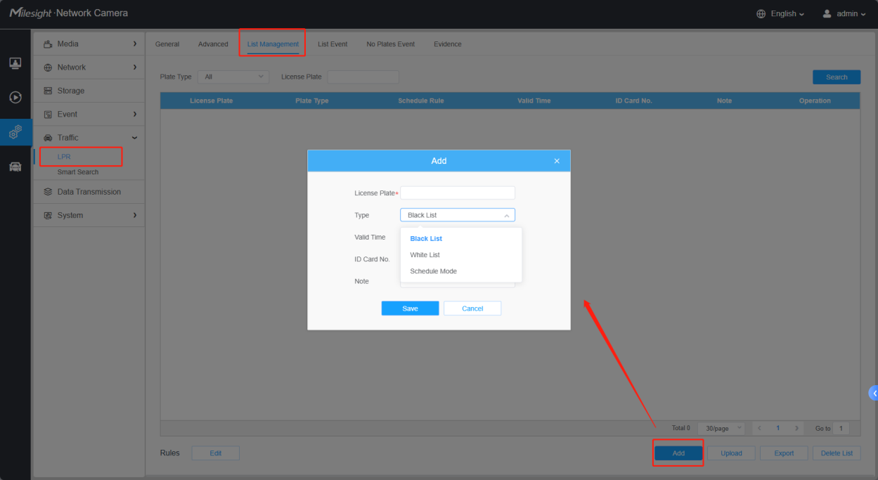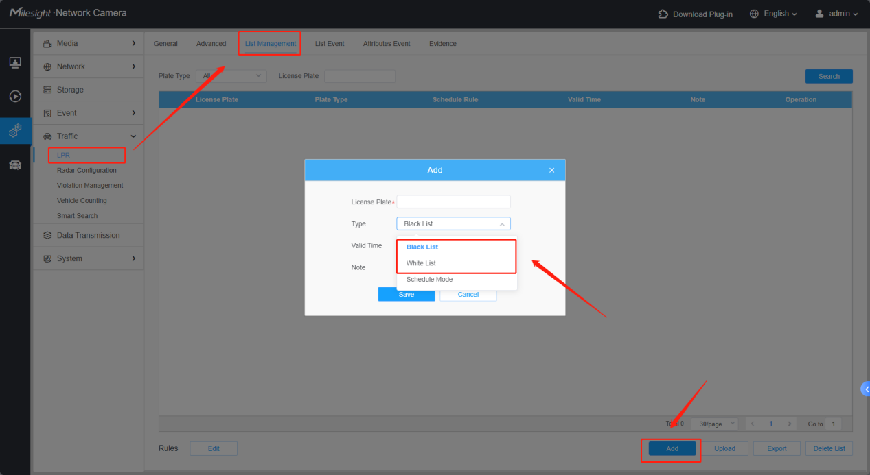 All license plate type definitions can be configured or imported through the list management interface. License plates not in the blacklist/white list are considered visitors.