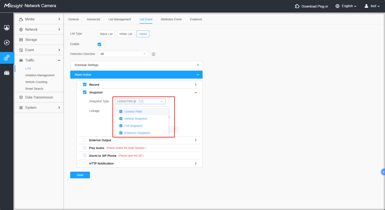 Enter the event interface of the required license plate type, turn on and enable the alarm action as record/snapshot, select save to storage, and check the required screenshot type.