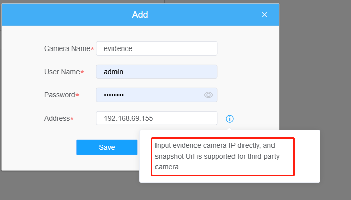 2. Click add button,then fill in the required evidence camera account information and related addresses.