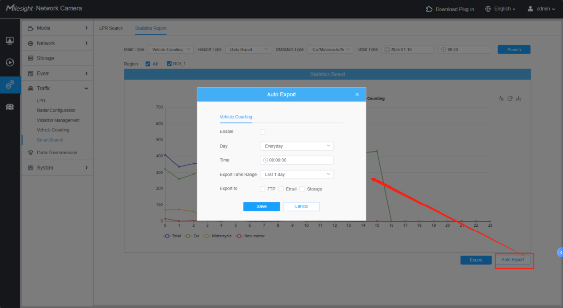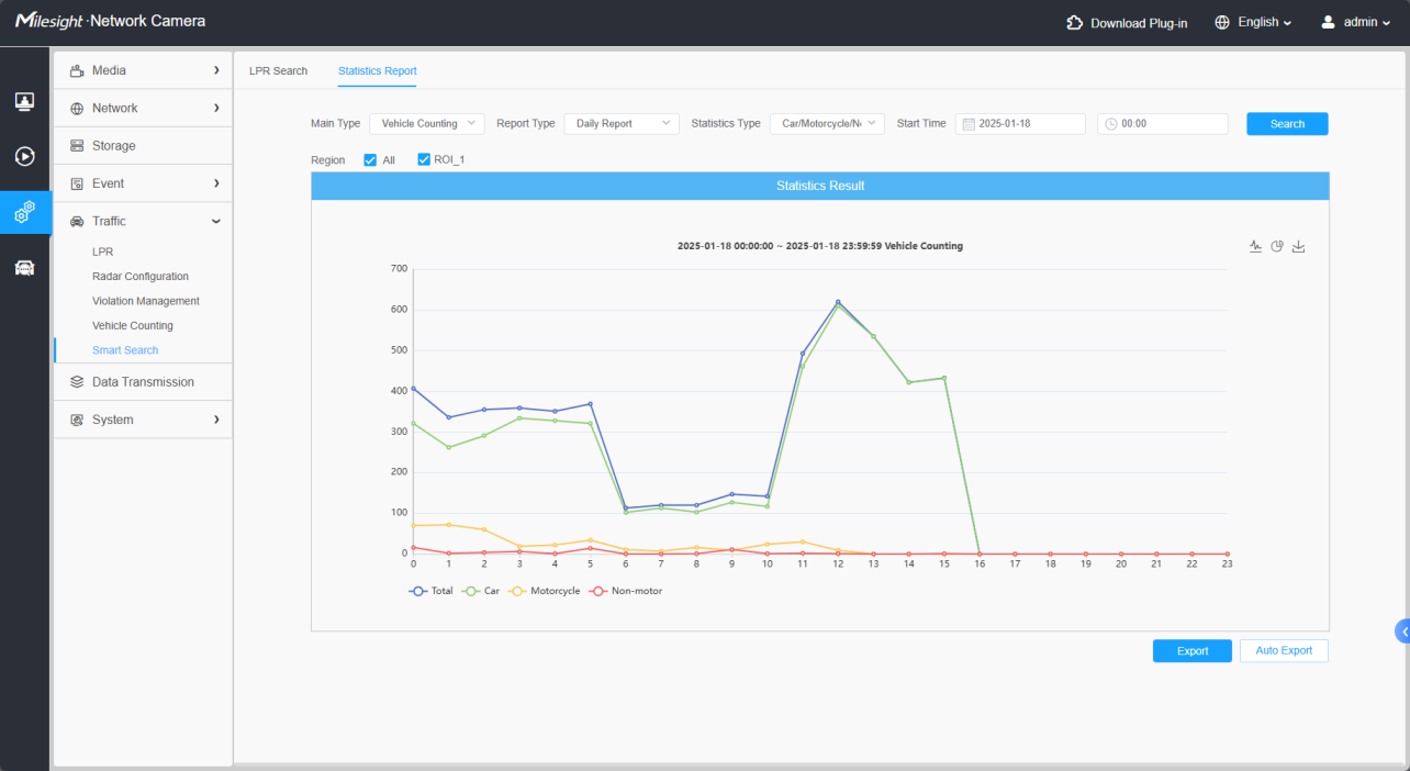 Statistics Report is for vehicle counting function, which can search the vehicle statistics report within the selected time period by day/week/month.